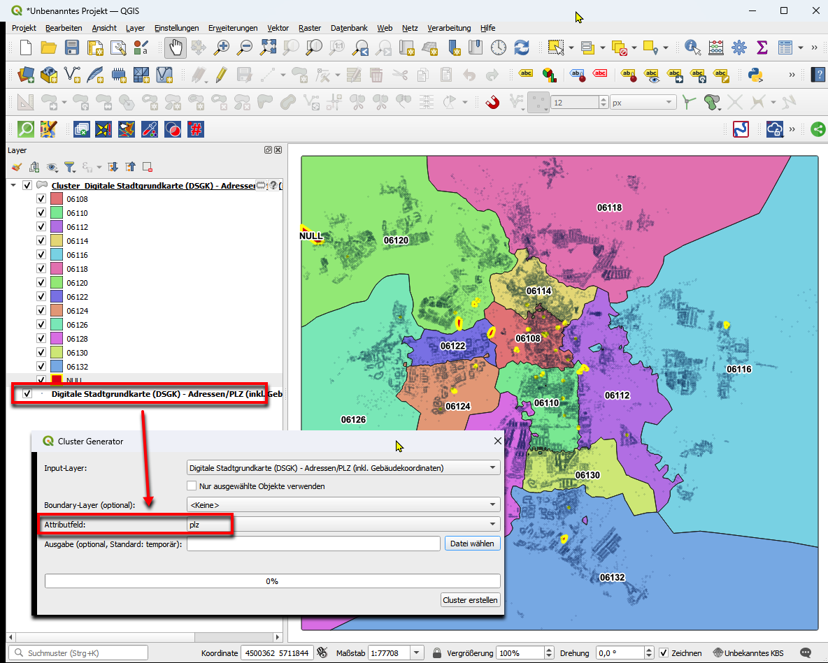 Ich habe das Plugin mal kurz angetestet, die Bedienung ist einfach und selbsterklärend. Genutzt habe ich dazu unseren Postleitzahlen- (PLZ-) Datenbestand. Der automatisch einmal pro Nacht generierte Datenbestand hat vfür Halle (Saale) momentan 34098 Punkte mit PLZen. Die Clusterfunktion darauf angewendet liefert recht schnell die Clusterflächen mit den PLZ-Bereichen und färbt und beschriftet diese automatisch nach dem ausgewählten Attributfeld, hier also „plz“. Das Formular und die Ergebnisse findet Ihr in Screenshot 1.