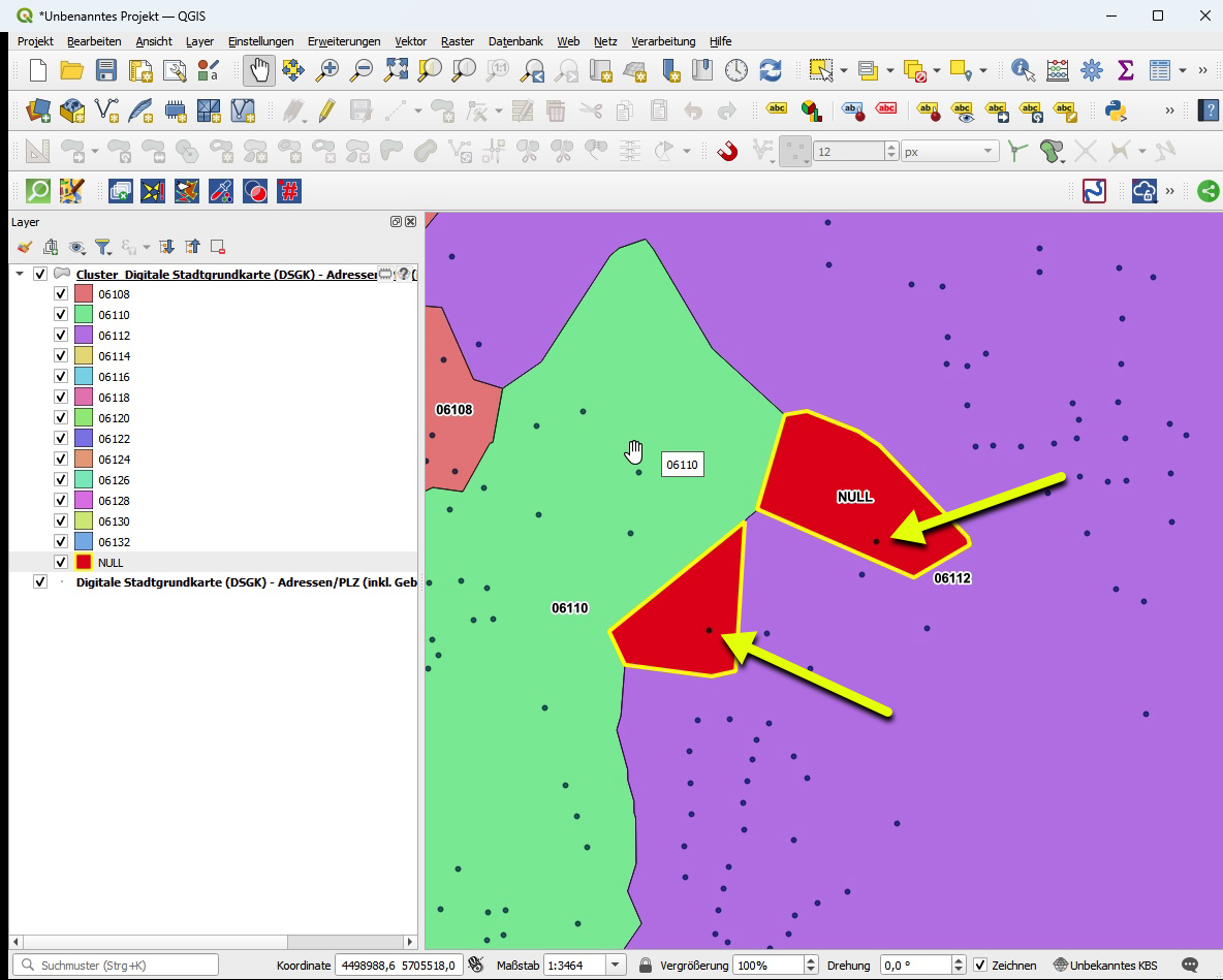 Ein wunderbarer, positiver Nebeneffekt. Man findet so auch ganz schnell, quasi nebenbei die fehlerhaften Objekte, bei meinem Test die Punkte mit dem Eintrag „plz=NULL“. Ich habe diese NULL-Flächen mal etwas hervorgehoben. Für die Punkte in diesen Flächen sind die PLZ-Attributwerte also zeitnah zu aktualisieren, von „NULL“ auf die tatsächliche PLZ oder die Punkte an sich sind zu überprüfen.