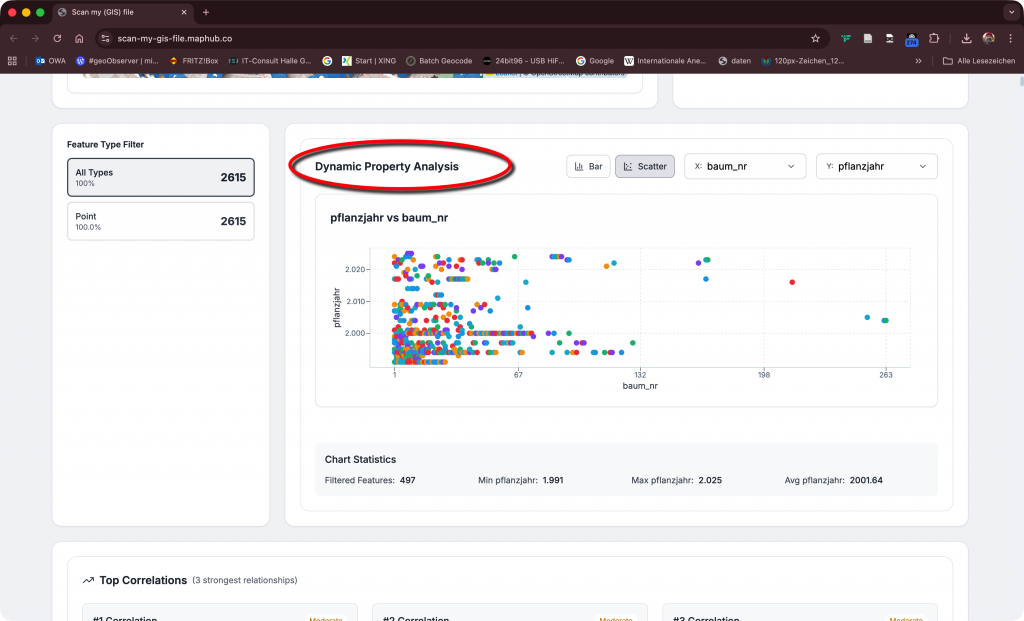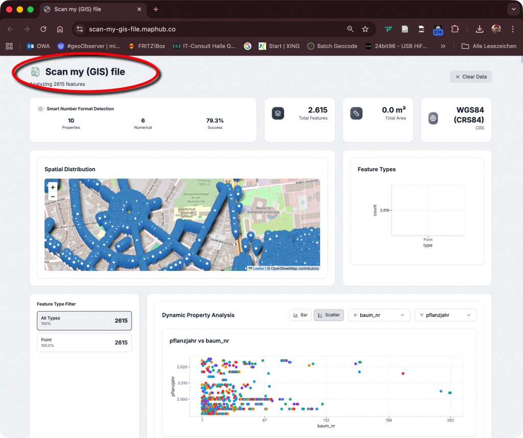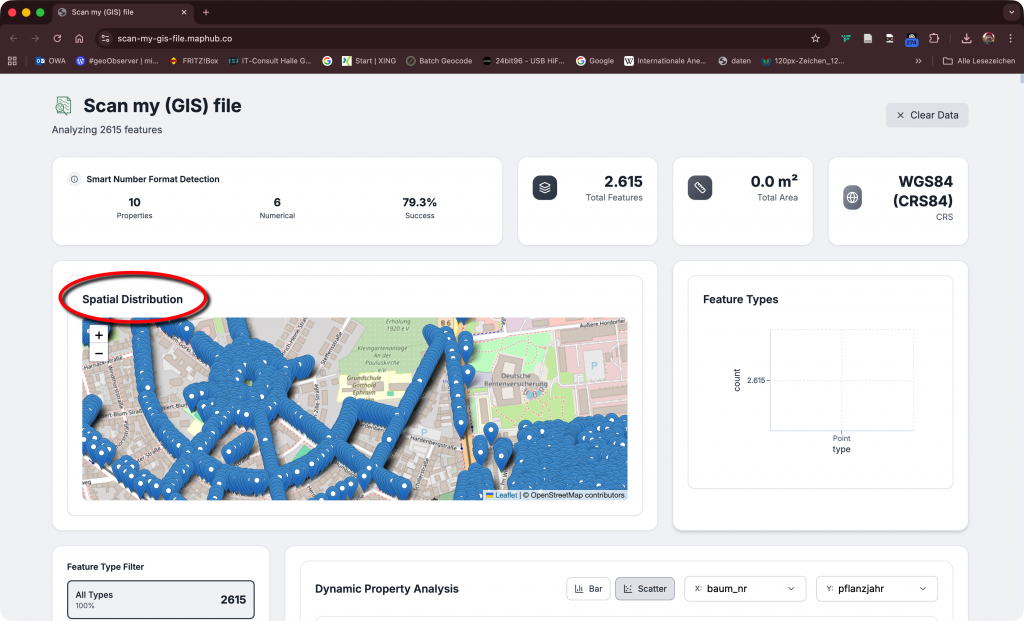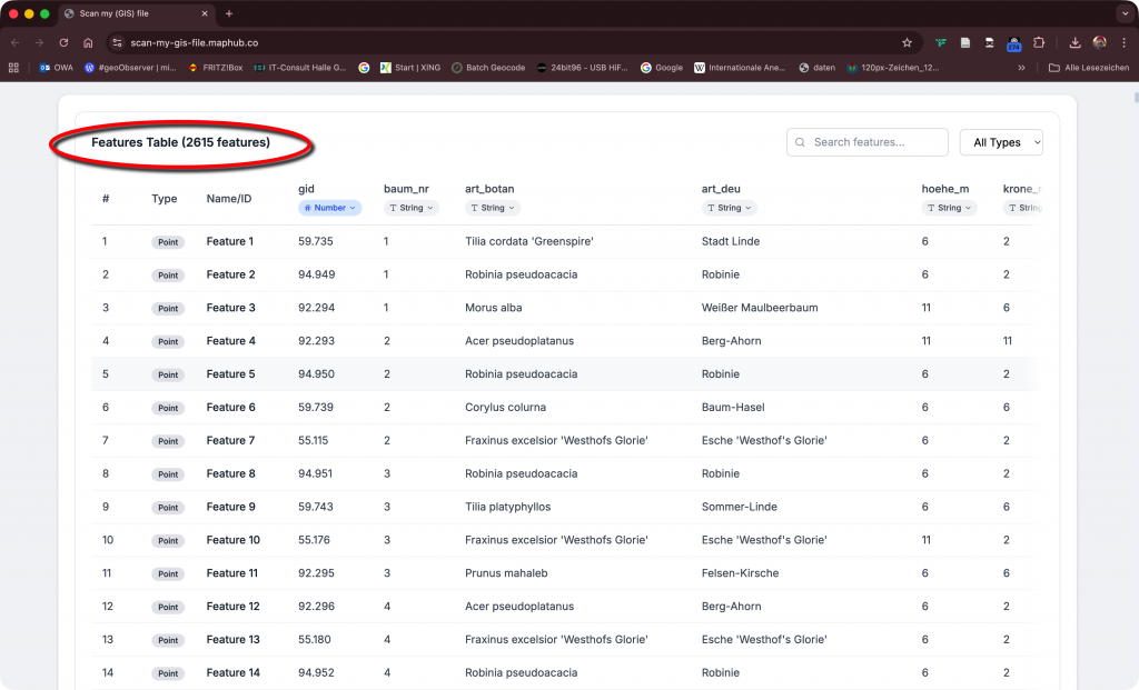 Ich habe „Scan my (GIS) File“ mal mit einem Extrakt (2615 Bäume von derzeit 55913) der Bäume aus dem Baumkataster im Open Data Portal Halle [3] als GeoJSON (945 kByte) getestet, es klappte auf Anhieb und war superschnell. Die folgenden Screenshots zeigen die Ergebnisse: