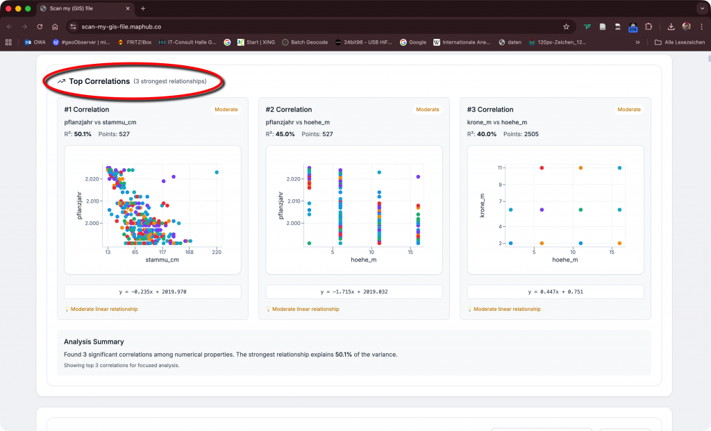 Auf LinkedIn [1] hat ich die Tage einen coolen Tipp bzgl. eines Geodaten Explorer Tools gefunden. „Scan my (GIS) File“ [2] von Alexandre Larroumets ist ein einfach zu bedienender Viewer und Analyzer für verschiedene GeoDatenFormate, wie GeoJSON, GeoParquet, FlatGeobuf, GeoPackage, Shapefiles und CSV-Dateien. Einfach Euer File via Drag & Drop hochladen und staunen. Neben der Visualisierung auf einer OSM-Karte liefert der Viewer sekundenschnelle die Anzahl der Objekte, Balkendiagramme und Streudiagramme für geostatistische Daten, automatische Korrelationen zwischen Datenspalten und eine Sicht in die Attributtabellen.