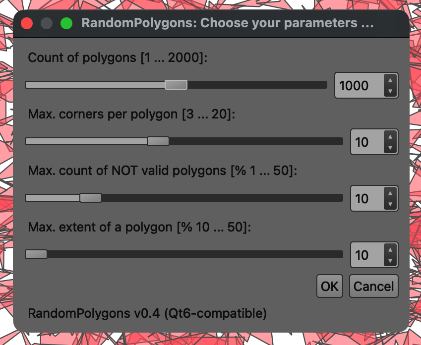 Seit dem gestern, dem 27. Oktober 2025 ist eine neue Version meines QGIS-Plugins „RandomPolygons“ [1] zum Download verfügbar. Das Plugin dient der unkomplizierten Generierung zufälliger, teilweise auch beabsichtigt fehlerbehafteter Testdaten, das kann für Entwicklung und Test von GI-Systemen sehr wichtig sein. Es generiert n zufällige Polygone in der Ausdehnung des aktuellen Kartenausschnittes und im aktuellen Koordinatenbezugssystem.