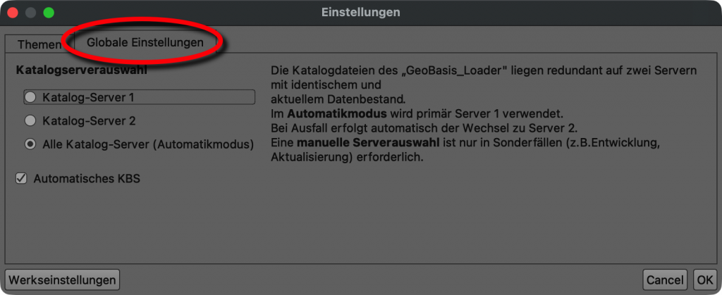 Neuerung 2b: Bei den „Globalen Einstellungen“ kann der Server für die JSON-Steuerfiles für die Kataloge explizit gewählt werden. Dabei ist Server 1 auch gleichzeitig Entwicklungs- und Testserver. Standardmäßig ist der Automatik-Modus aktiviert. Kann aus irgendeinem Grund nicht mit Server 1 verbunden werden, wird es automatisch bei Server 2 versucht.