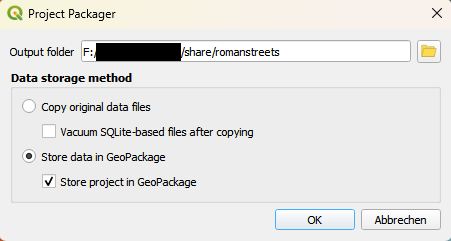 Dann erhält man nämlich ein einzelnes GeoPackage, in dem auch das Projekt selbst enthalten ist.