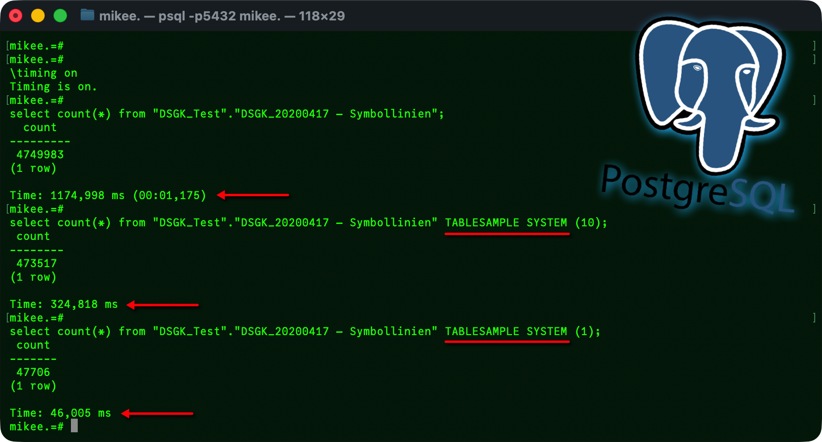 Mehr Infos inklusive dem Unterschied zwischen TABLESAMPLE SYSTEM und TABLESAMPLE BERNOULLI findet Ihr auch „How to Use Table Sampling in PostgreSQL“ bei Cybrosys [4]