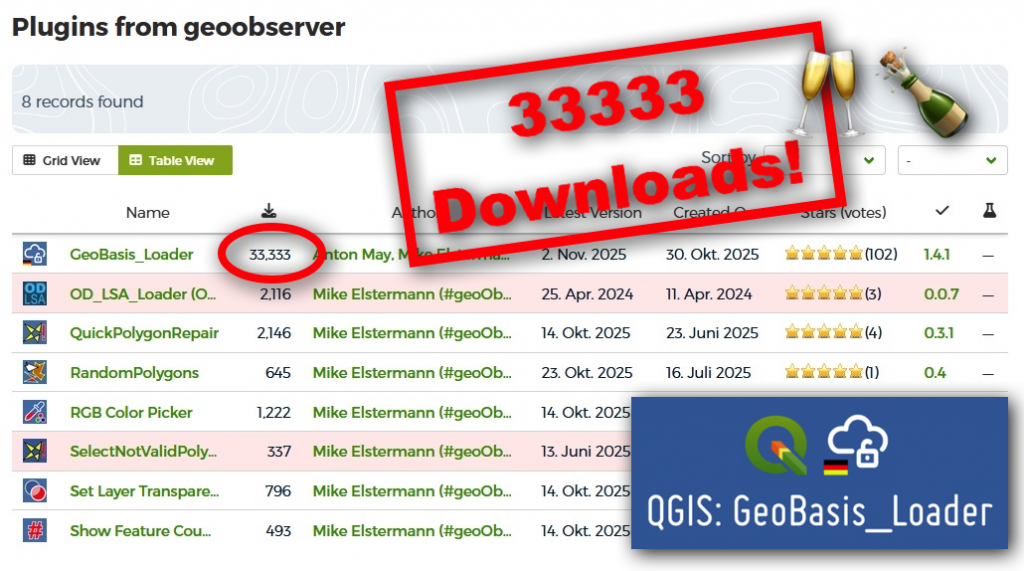 Gestern war es soweit, das QGIS-Plugin „GeoBasis_Loader“ [1] konnte den 33333. Download verzeichnen. Ein Grund zum Feiern, Prost 🙂