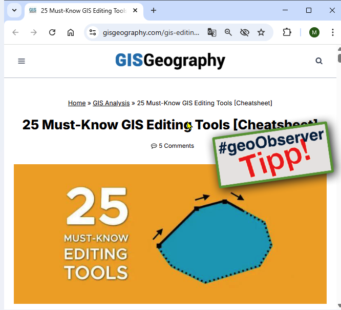Einen coolen Beitrag zum Einstieg für GIS-Neulinge und als Auffrischung für gestandene GIS-Nutzer (Profis und Nerds) habe ich bei GISGeography in „25 Must-Know GIS Editing Tools“ [1] gefunden. Trace, Move, Rotate, Buffer, Scale, Reshape, Simplify, … die meisten Funktionen kennt Ihr vermutlich, aber hättet Ihr auch alle zusammen gekriegt? 😉