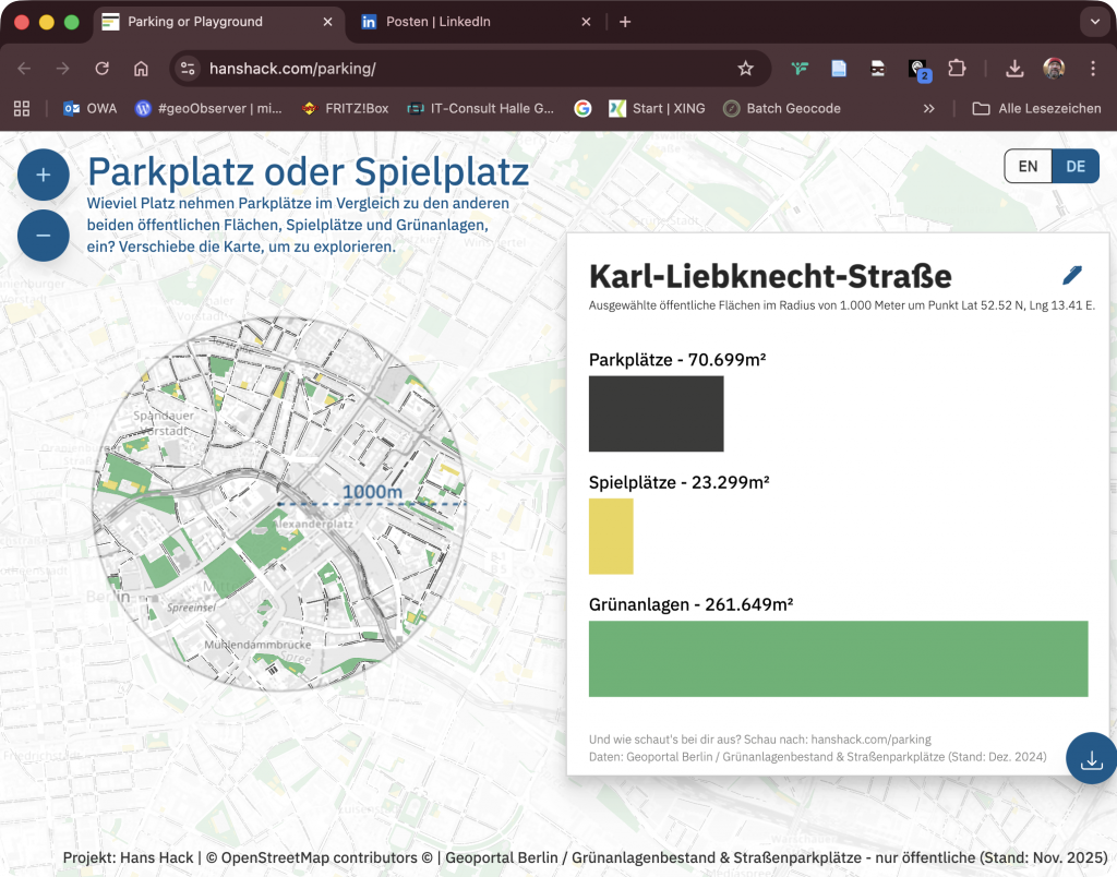 Und schon wieder eine interessante Lösung von Hans Hack aus Berlin. Er stellt die Frage, wie sich der öffentliche Raum nach den Nutzungen Parkplätze, Spielplätze und Grünanlagen aufteilt. Und er liefert auch gleich eine entsprechende webbasierte Karten-Anwendung „Parkplatz oder Spielplatz“ [1] zur Analyse und Visualisierung im Umkreis von 1000 m um den interessierenden Punkt mit, für ganz Berlin! Die Daten für die Grünanlagen und die öffentlichen Straßenparkplätze kommen aus dem Geoportal Berlin [3].