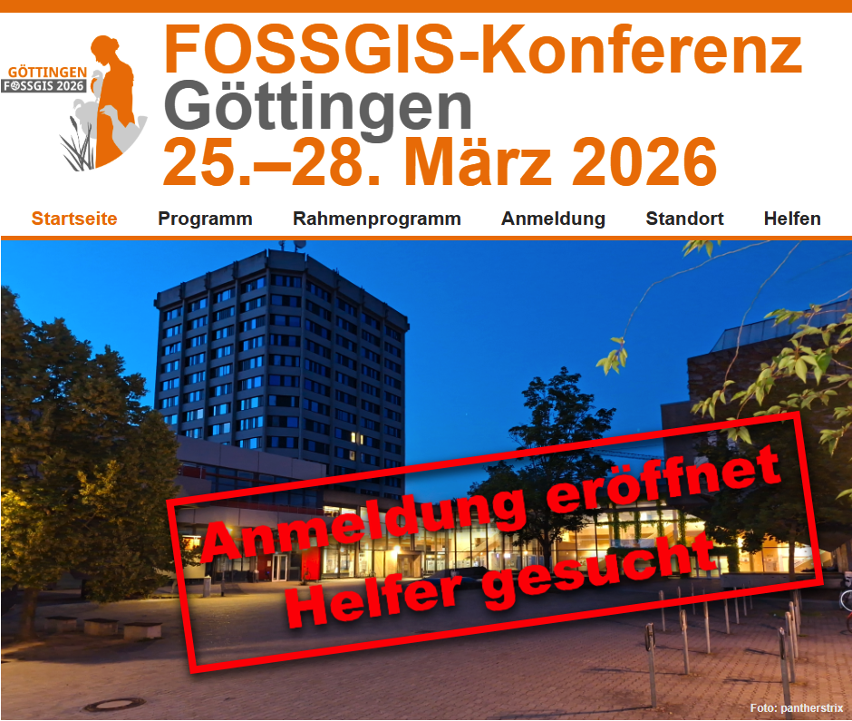 Das Konferenzorganisationsteam der FOSSGIS 2026 [1] teilte am Donnerstag mit, dass die Anmeldung zur FOSSGIS-Konferenz 2026 freigeschaltet wurde. Ihr findet die Anmeldung auf der FOSSGIS 2026-Anmeldungsseite [2].