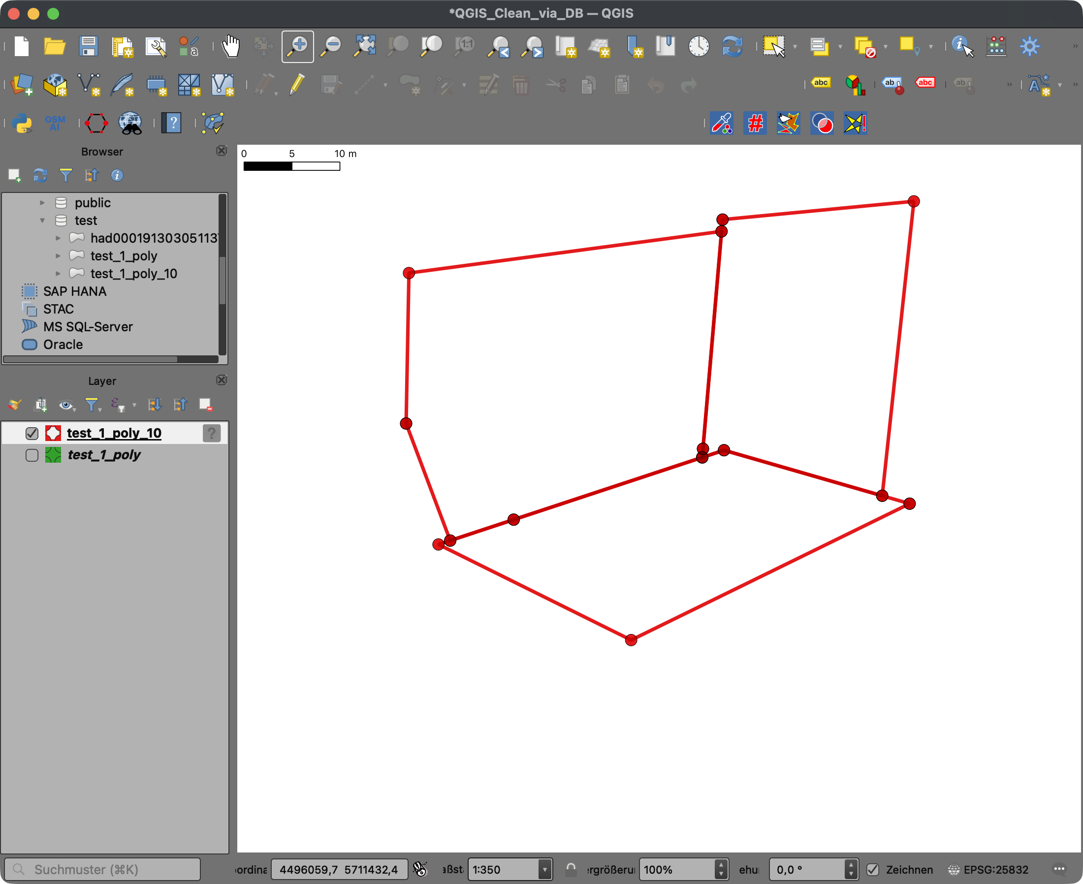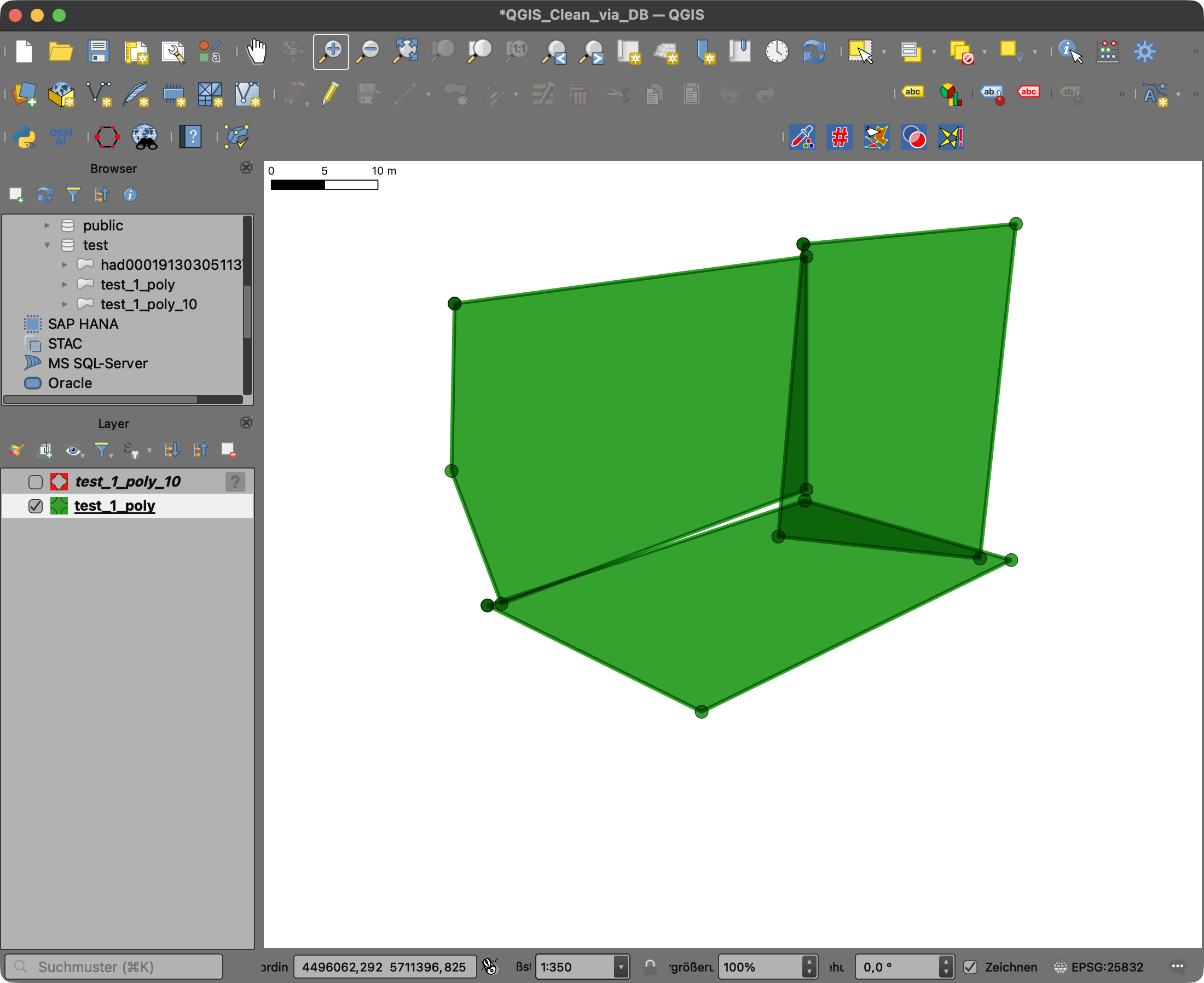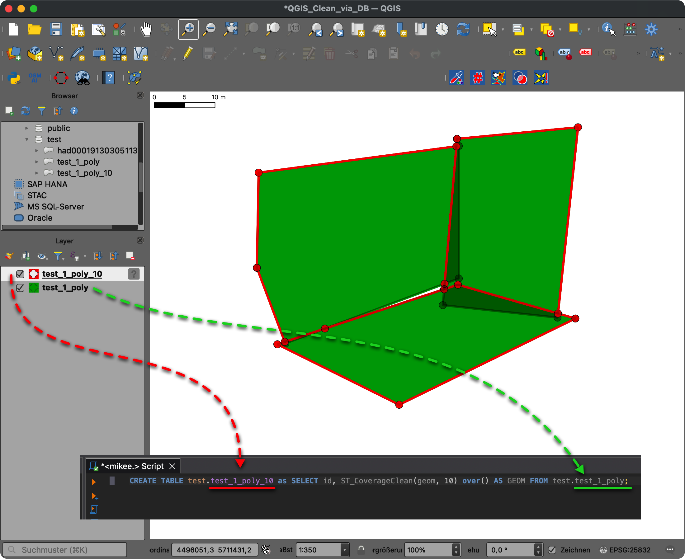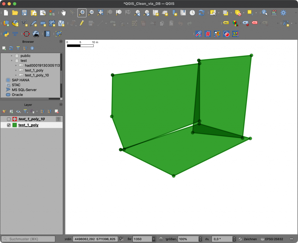 In meinem vorgestrigen Beitrag [1] gab es wohl einige Fragen [2] bzgl. meiner Ausführungen bei der gemeinsamen Nutzung der vereinfachten Daten in einer Datenbank. Da vermutlich nicht alle die Diskussion verfolgen, versuche ich jetzt noch einmal zu präzisieren. Per SELECT wird die Vereinfachung natürlich nur einmalig für den Anfragenden berechnet, nur ihm/ihr steht das Ergebnis zur Verfügung. Nutzt man die Funktionen hingegen, um die Daten innerhalb der Datenbank zu vereinfachen und das Ergebnis in diese zurück zuschreiben, z. B. mit CREATE, stehen die Ergebnisse dann allen berechtigten Nutzern zur Verfügung. Hier ein Beispiel, die Eingangsdaten werden mit einer Toleranz von 10m mit der CLEAN-Funktion (ST_CoverageClean) [3] vereinfacht:
