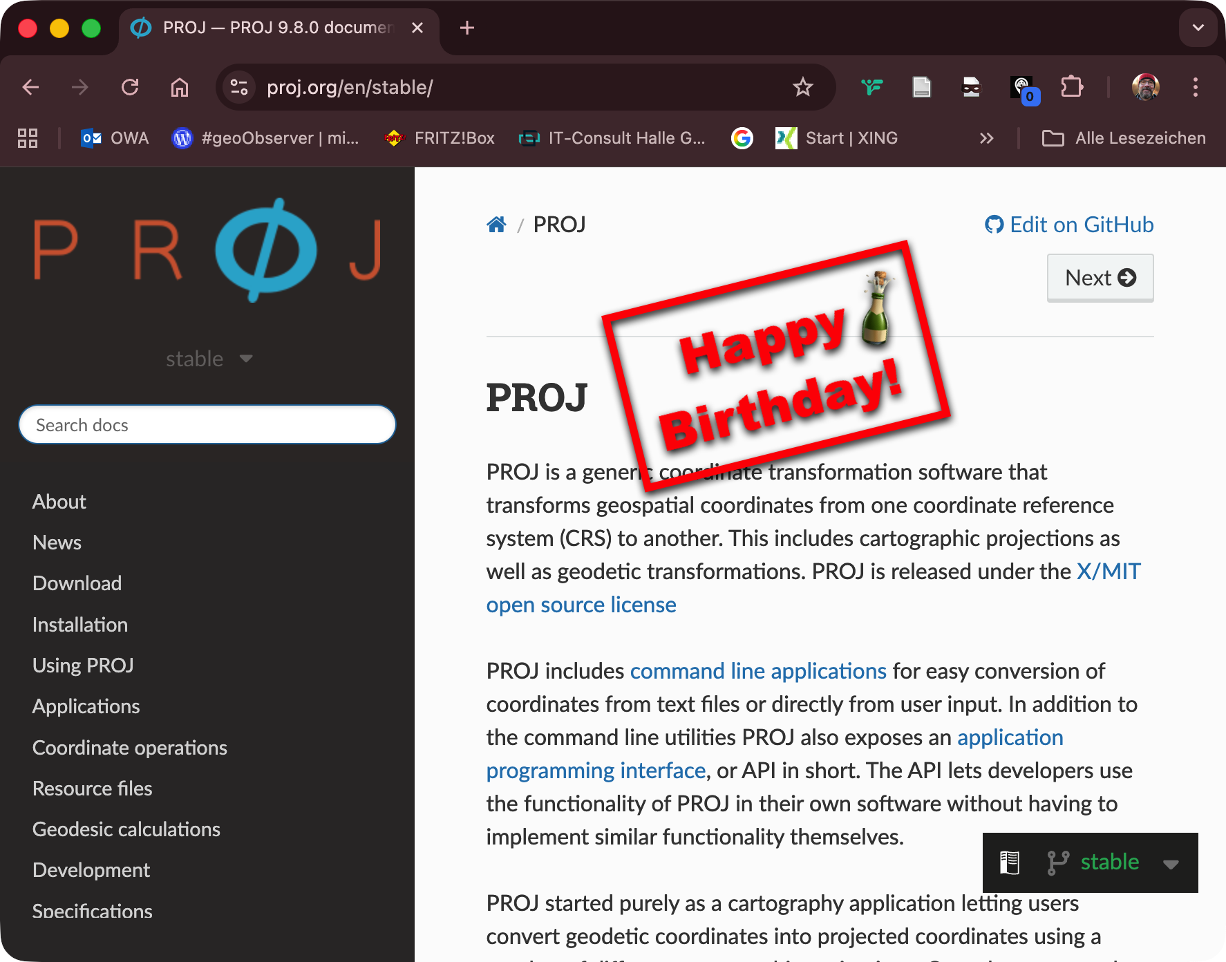 Die seit Jahrzehnten erfolgreich(st)e Koordinaten-Transformation-Software “PROJ” [1] feiert heute den 27. Geburtstag [2] und der #geoObserver gratuliert. Die Software ist in vielen GI-Systemen im Einsatz [3], z. B. bei QGIS, GDAL, GRASS GIS, MapServer, PostGIS, R, FME, ESRI, … Danke allen Betreuern und Mitwirkenden [4] und bitte weiter so!