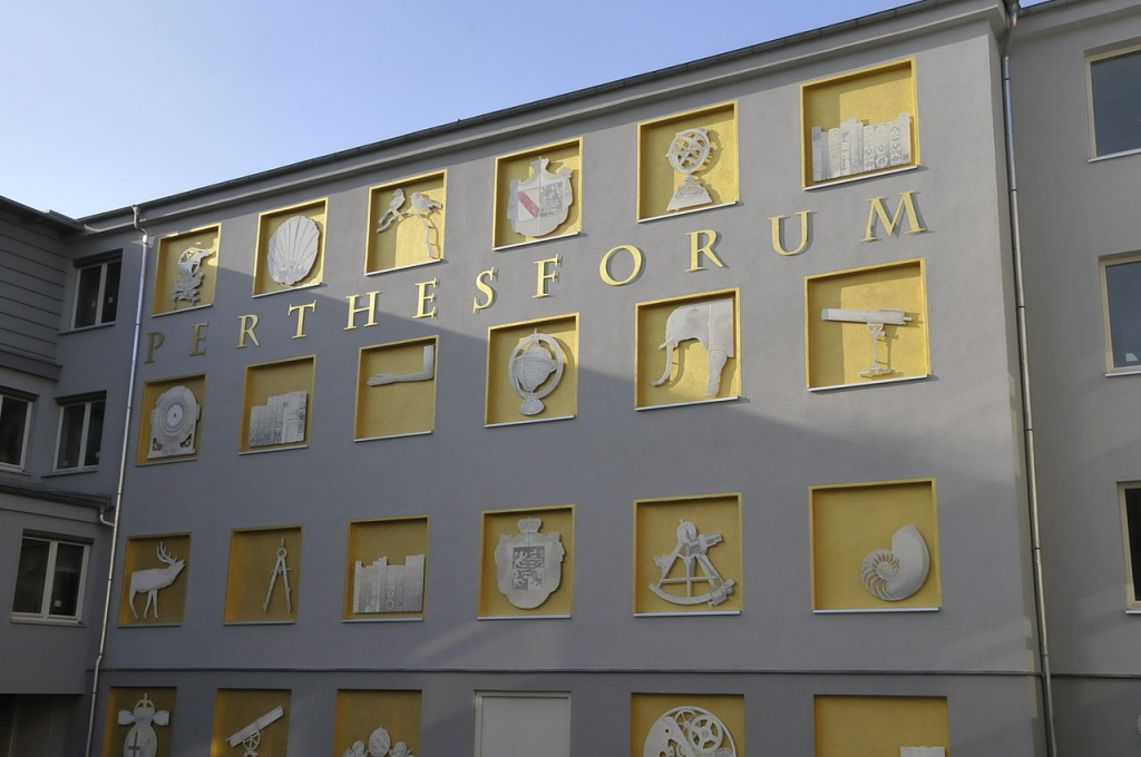 Das ließ mich aufhorchen, da ich in letzter Zeit zweimal in Gotha war, aber keine Ahnung hatte, wo diese Karten entstanden sind. In Gotha ist mir aber das Perthes Forum [4] aufgefallen, von dem ich noch nie etwas gehört hatte. An einer Fassade des Forums waren verschiedene Symbole angebracht. Meine Recherchen haben dann ergeben, dass genau hier die Karten der VEB Hermann Haack Geographisch-Kartographische Anstalt Gotha hergestellt wurden. In dem Gebäude befindet sich heute die Perthes-Gotha-Kartensammlung der Forschungsbibliothek Gotha der Universität Erfurt.