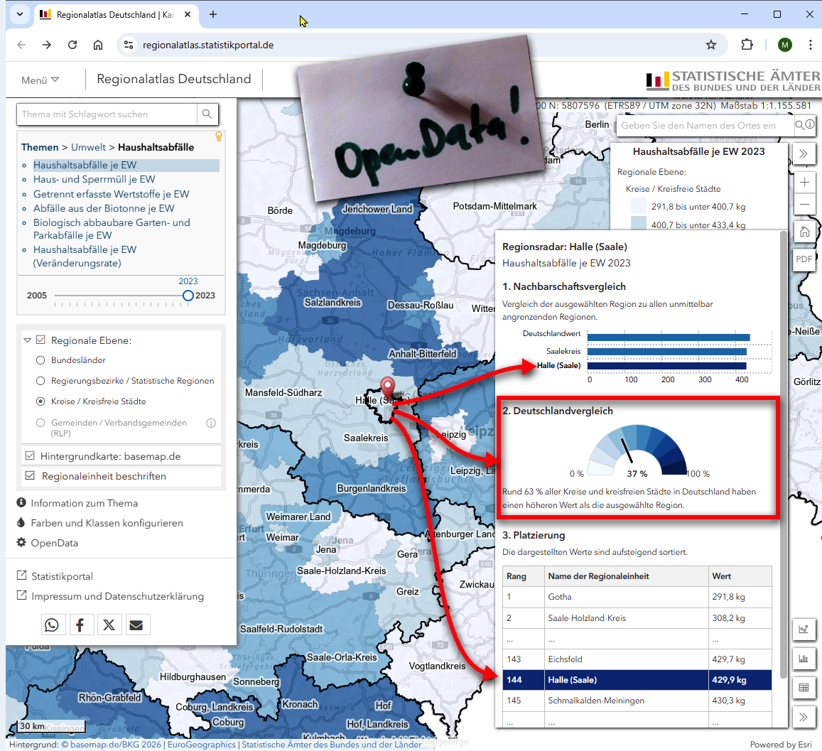 Im Regionalatlas [1] kann man eine Vielzahl der Daten der Statistischen Ämter des Bundes und der Länder entdecken und recherchieren. Neben der interaktiven Karte lassen sich die Daten auch als Zeit-Diagramme, Häufigkeitsverteilungen und in Tabellenform nutzen. Eine Neuerung ist die Möglichkeit, die Daten auch regional zu vergleichen, dazu gibt es die neue Funktion „Regionsradar“. Wusstet Ihr z. B., dass die Stadt Halle (Saale) beim Thema „Haushaltsabfälle je EW 2023“ an 144. Stelle von 388 steht, d. h. „Rund 63 % aller Kreise und kreisfreien Städte in Deutschland haben einen höheren Wert als die ausgewählte Region.„.