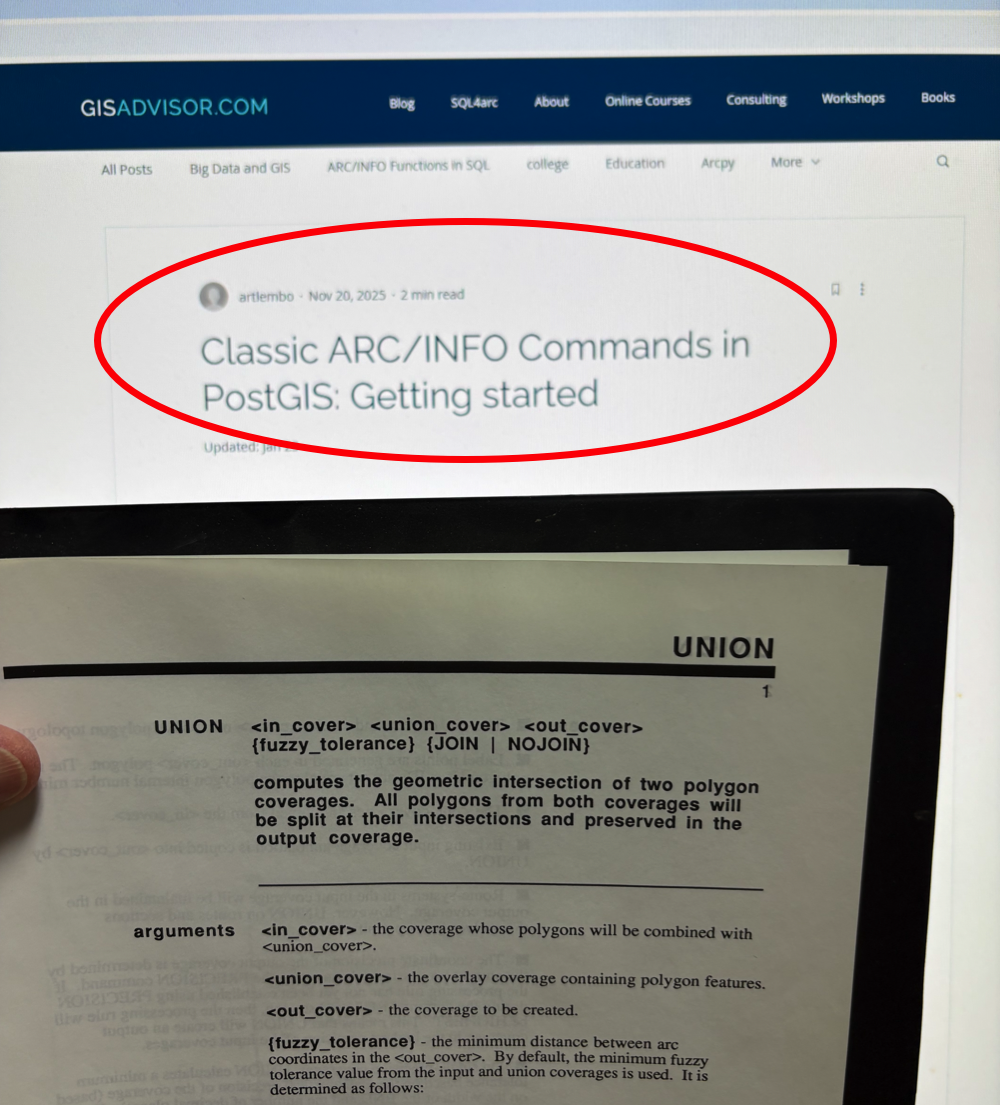 Ende 2025 bin ich nun auf zwei interessante Beitragsserien gestoßen „ARC/INFO Functions in SQL – ERASE, INTERSECT, IDENTITY, UNION“ [1] und „Classic ARC/INFO Commands in PostGIS: Getting started“ [2]. Bereits 2014 beginnend und bis heute fortgeschrieben zeigt der Autor, wie mal die alten Geoprozessing-Klassiker mit heutigen SQL/PostGIS-Mitteln realisieren könnte.