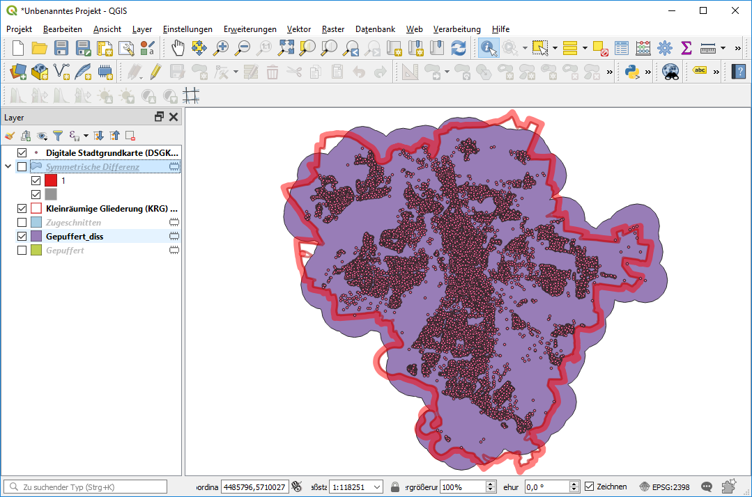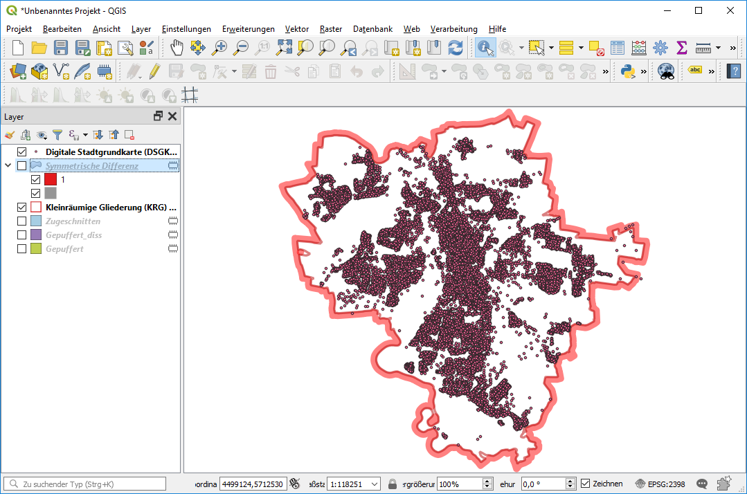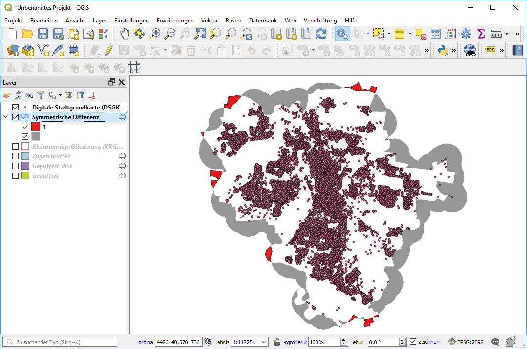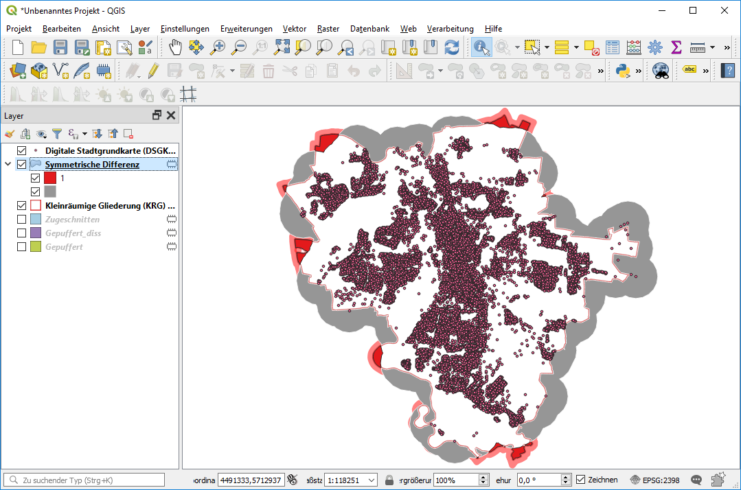 - Symetrische Differenz (Stadtgrenze ausgeblendet): Auf roten Flächen sind Windräder möglich