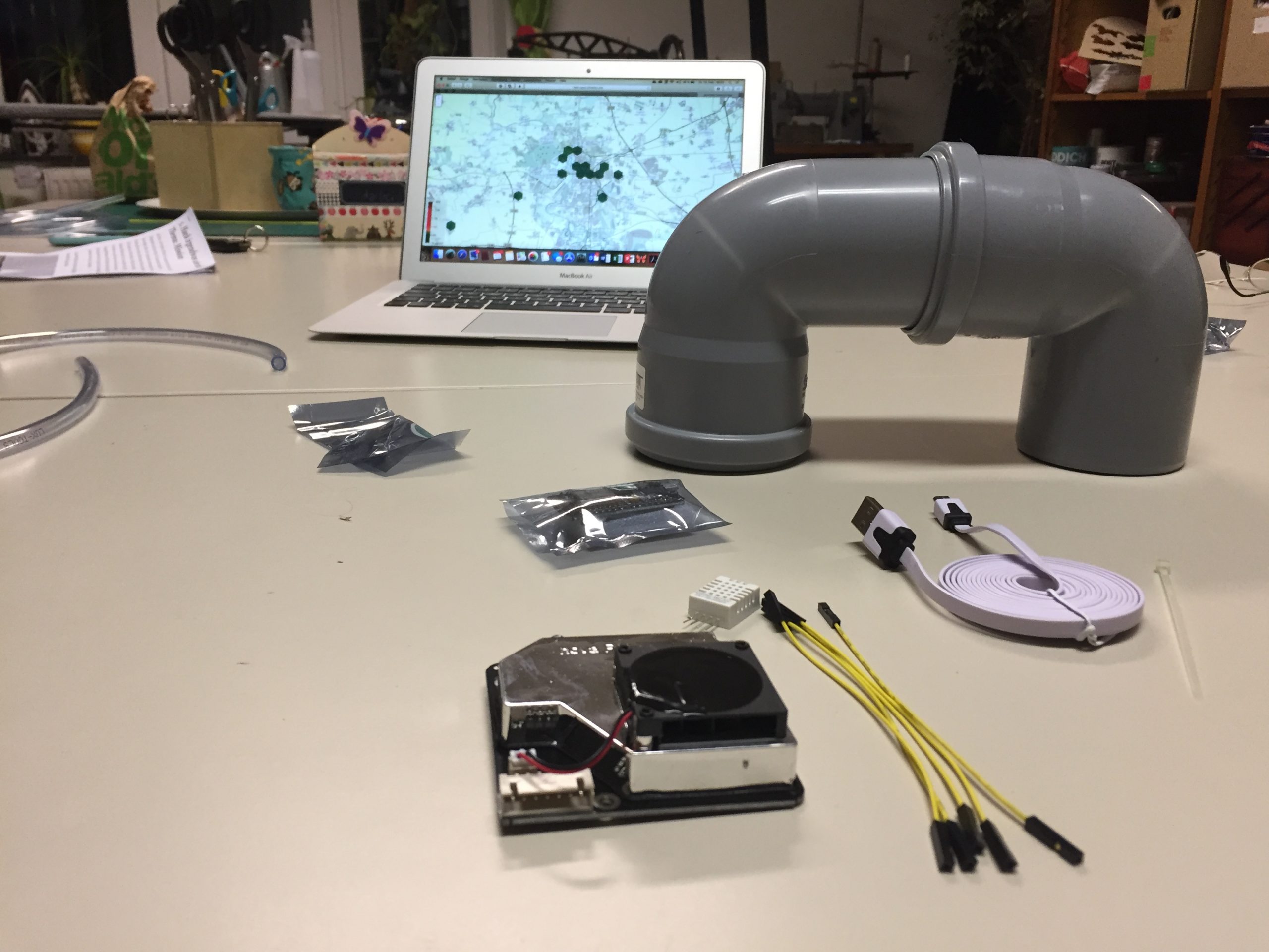 Aufmerksam wurde ich durch die Digitalen Themen, unsere Nachbarn am HALgis 2.0-Stand zumTag der Offenen Tür in Halle (7.1.2018) und entschloß mich sofort, selbst meinen Feinstaubsensor zu bauen und dann über das heimische WLAN im Internet für das gemeinsame Projekt zu betreiben. Gleich vor Ort angemeldet, der früheste Termin, der 13.02.2018 wurde angepeilt. Endlich war es soweit, trafen wir uns im halleschen Eigenbaukombinat zum Sensorbauen. Ging alles ganz schnell und gut, allein die Inbetriebenahme @home stellte sich als etwas schwierig heraus, mein Sensor war schnell mit dem WLAN und Internet verbunden, zeigte Temperatur und Luftfeuchtigkeit an, es fehlten aber noch die Feinstaubdaten. Hmm … dafür hatte ich ihn doch eigentlich gebaut?