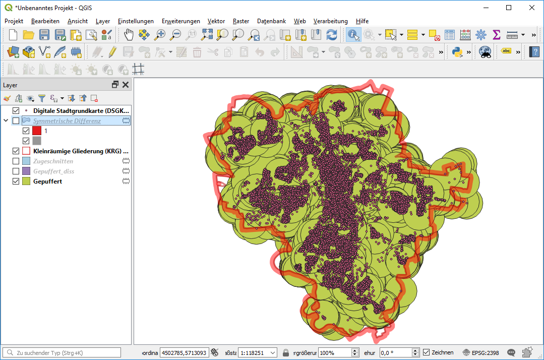 Simuliert in QGIS: Wo ist in Halle potenzieller Platz für Windräder? Buffer, Disslove, Symetrische Differenz. Einzig die roten Gebiete im letzten Bild bleiben übrig.