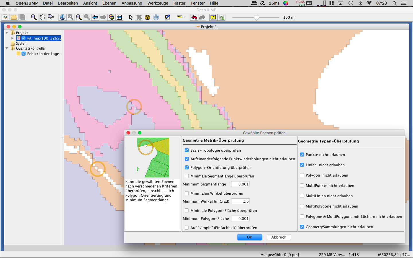 Ein wirklich gutes Tool, um Geometriefehlern schnell auf die Spur zu kommen ist das freie OpenJump. Es findet die Fehler nicht nur schnell und sicher, es visualisiert sie auch deutlich. Also, wer mal wieder am Verzweifeln ist, schickt Eure Daten einfach mal in die Qualitätskontrolle von OpenJump. Hilft fast immer!