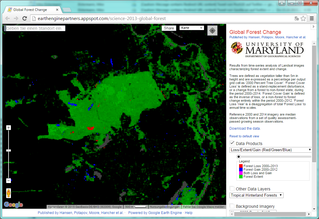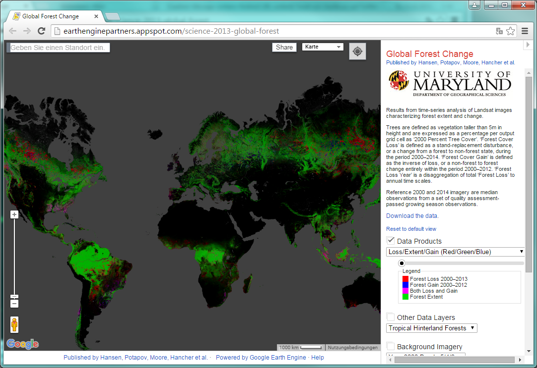 Die Erde hat 3000 Milliarden Bäume, jährlich werden 15 Milliarden gefällt, damit ist die Zahl der Bäume seit Beginn der Landwirtschaft vor 12000 Jahren um 46% gesunken! (Quelle: http://www.nature.com/news/global-count-reaches-3-trillion-trees-1.18287). Was liegt dann näher, als diese Daten auf der Karte zu visualisieren?