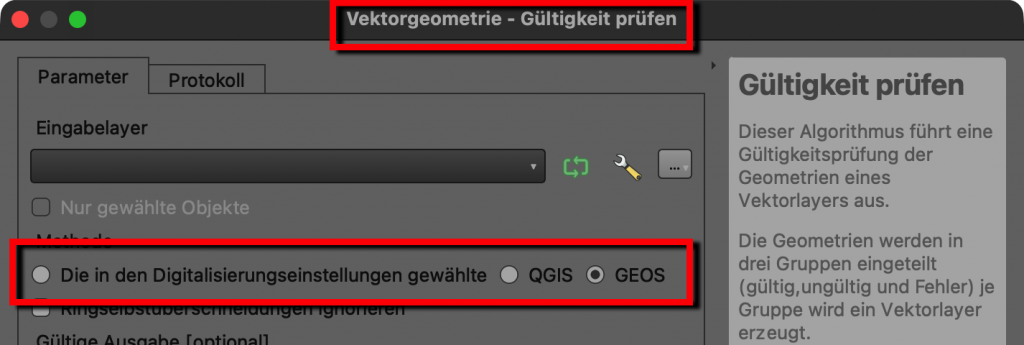 Screenshot 1: Prüf-Methoden „QGIS“ und „GEOS“ im Menü „Vektor / Geometriewerkzeuge / Gültigkeit prüfen …“