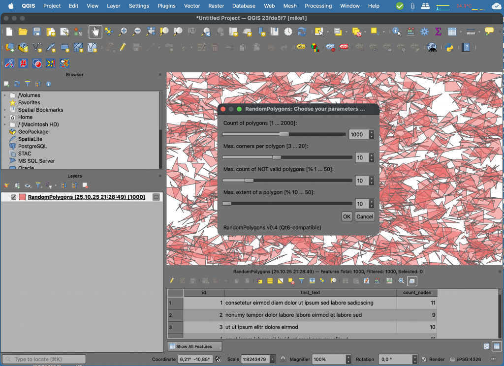 Das Plugin „RandomPolygons“ ist ursprünglich zur Generierung von Testdaten zur Erprobung meines Plugins „QuickPolygonRepair“ [2] entstanden. Übrigens: Ein nicht unerheblicher Anteil des Programmcodes wurde mit KI via ChatGPT erstellt.