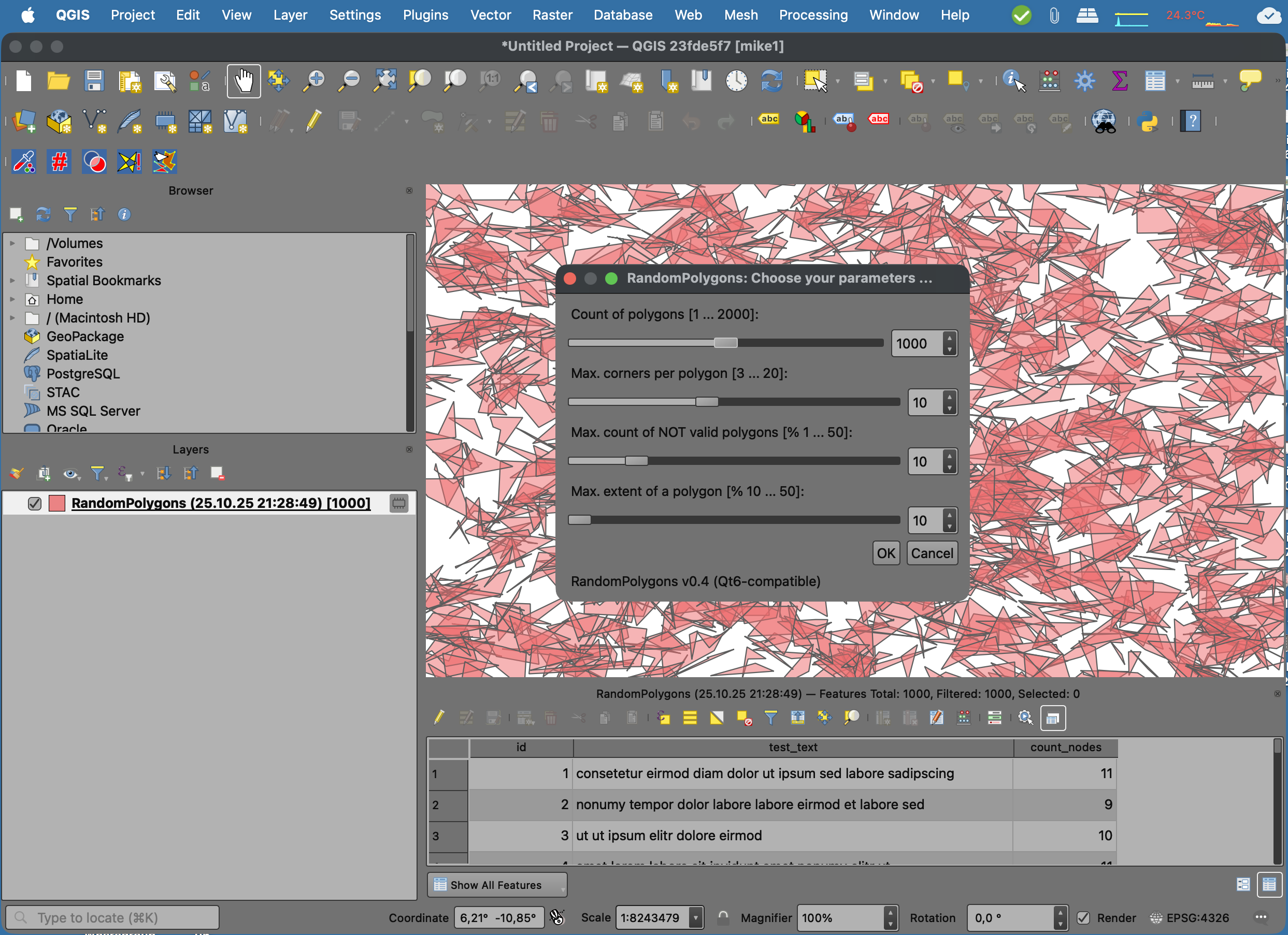Ab v0.4 (Qt6-compatible) unter QGIS > v3.44 wurde die GUI auf Slider/SpinBox umgestellt, ein Fortschrittsbalken (ProcessBar) eingeführt und die Performance bei der Generierung der Zufallstextspalte „test_text“ gesteigert.